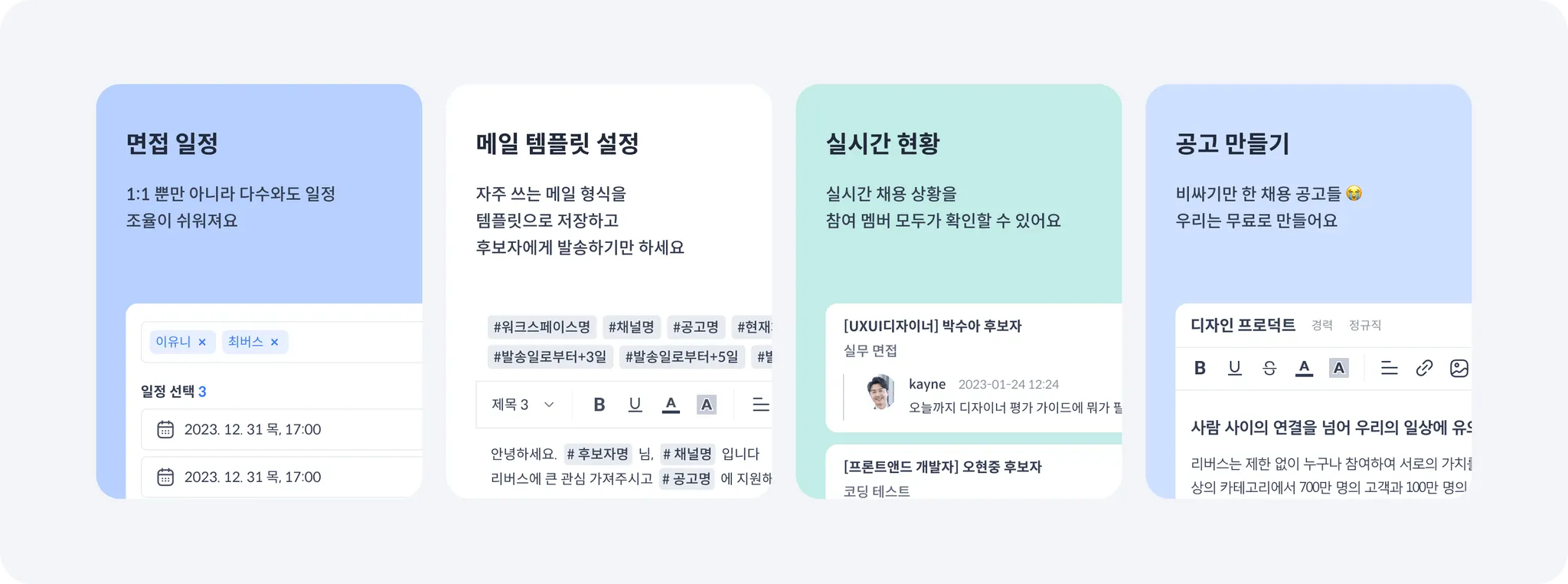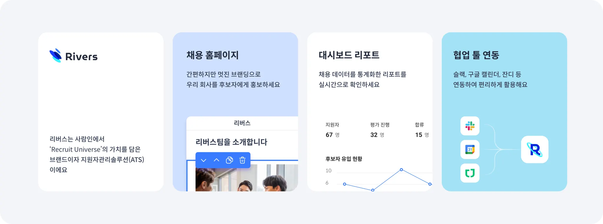채용 통합 관리 솔루션인 리버스는 공고, 지원자 관리, 협업 평가, 외부 서비스 연동 등