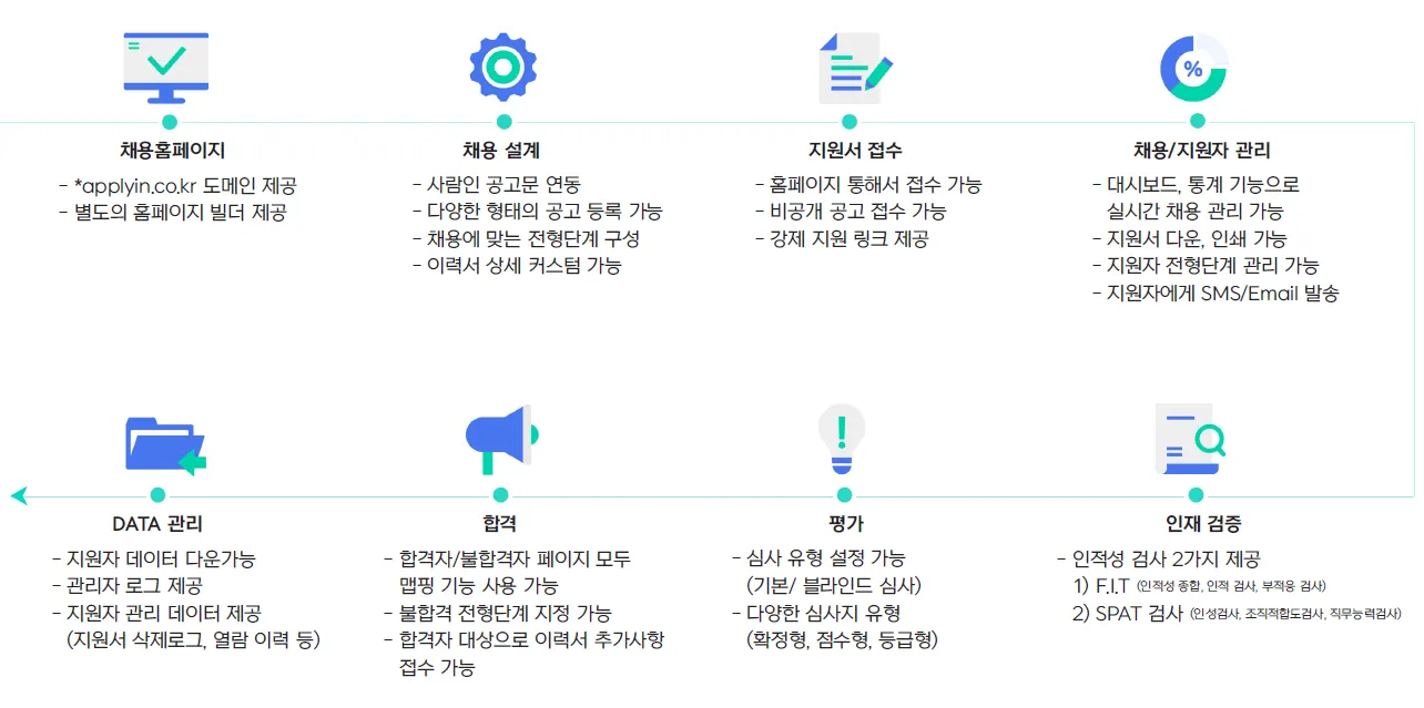 이력서 접수부터 합격 발표까지 채용의 모든 과정을 빠르고 효율적으로 처리할 수 있고, 온라인 인적성 검사를 통해 지원한 인재에 대한 검증까지 가능합니다.