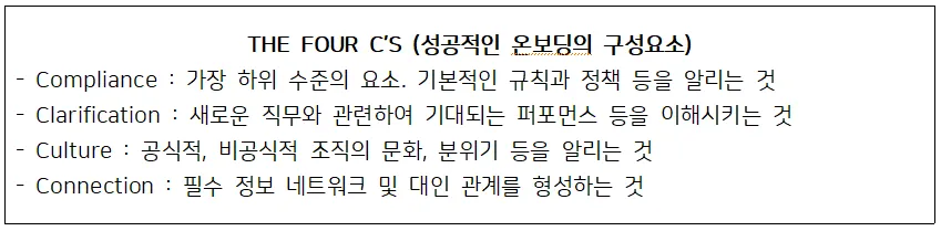 2010년, SHRM(Society for Human Resource Management)에서 발행한 ‘Onboarding new employees : Maximizing success’에는 성공적인 온보딩을 위한 네 가지 요소(Four C’s)를 다음과 같이 소개하고 있습니다. 다음의 네 가지 요소를 조화롭게 갖추고 있어야 가장 상위 수준의 온보딩 프로세스를 갖추었다고 말할 수 있다는 것인데요.