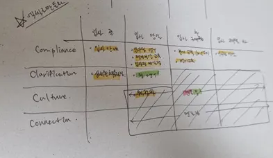 이렇게 준비한 두 가지 기준으로 그린 현황 점검 표는 아래 그림과 같습니다. 보고서를 위한 표라기보다는 브레인스토밍을 위한 간이 지도를 그린 셈이어서 표 수준은 informal 합니다. (보고서를 올릴 순 없었습니다…) 여기에 프로그램의 주체를 HR팀, 현업 팀, 신규 입사자 세 가지로 분류하여서 색도 구분해 봤네요.